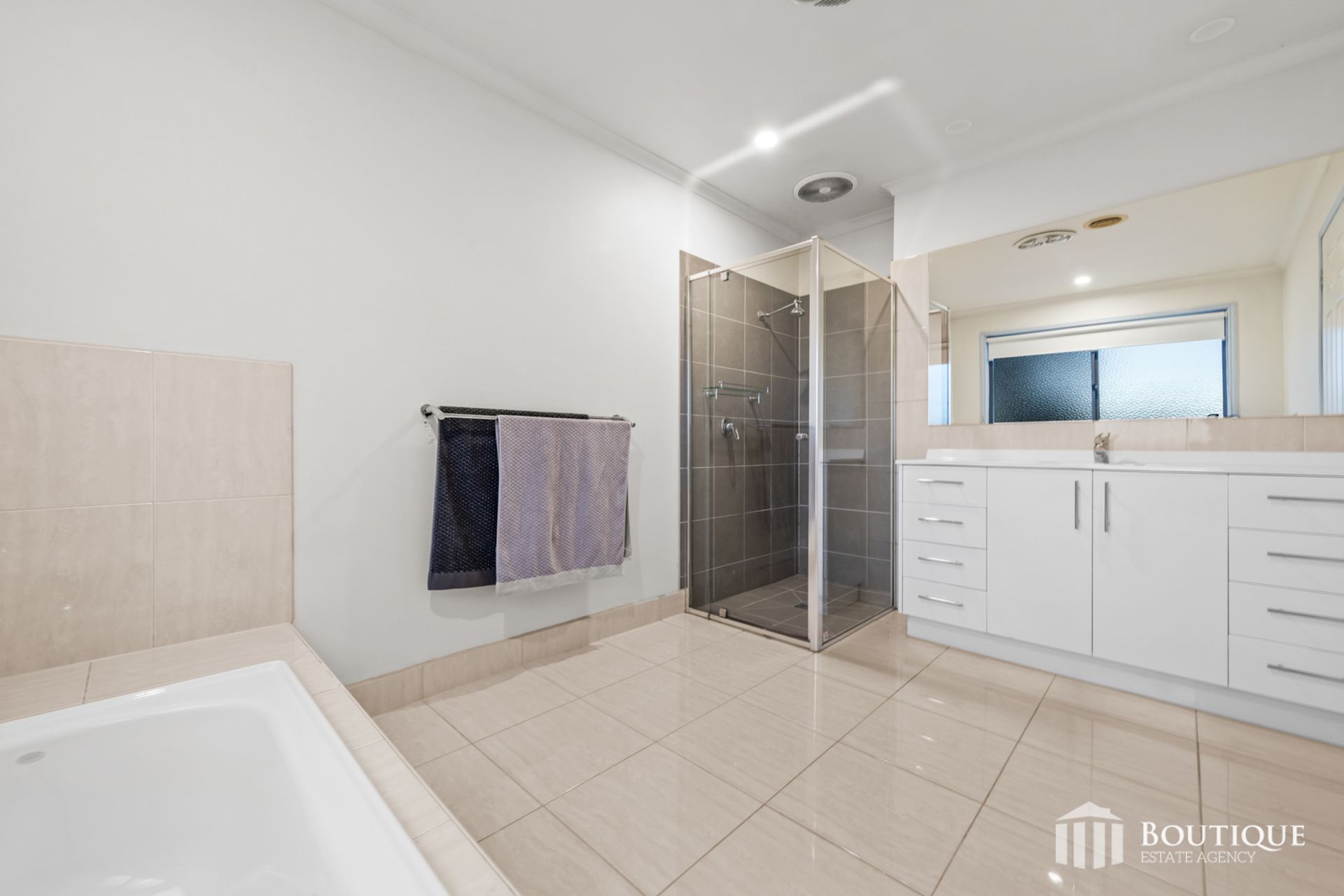 The master bedroom features a walk-in robe and private ensuite, while additional bedrooms include built-in robes and ceiling fans. Three of the bedrooms are equipped with split system units, ensuring year-round comfort. The home is further enhanced by gas ducted heating, evaporative cooling, a ducted vacuum system, and energy-efficient insulation and doors.