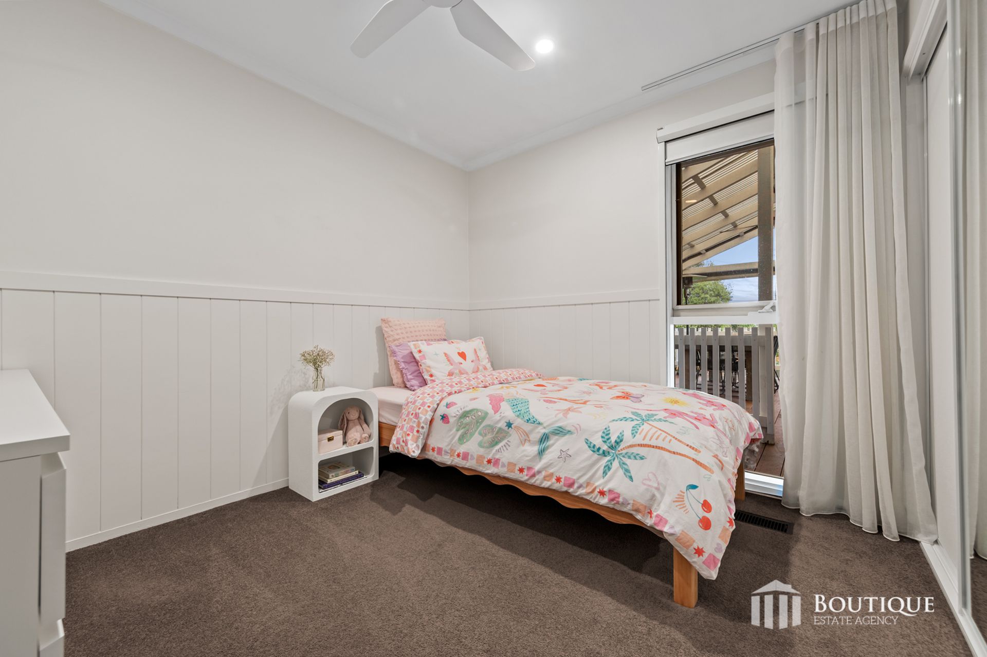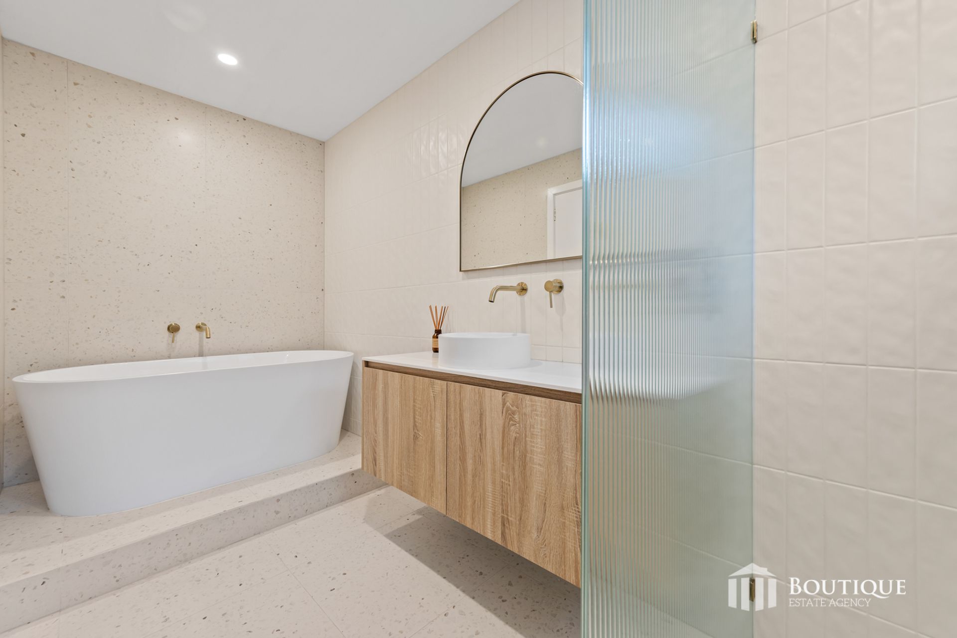 Accommodation includes four generous bedrooms, all fitted with built-in robes and ceiling fans. One bedroom features blackout curtains for added comfort. The master suite boasts a walk-in robe and stylish ensuite, while the central bathroom continues the luxe feel with full-height tiles, brass accents, and a spacious walk-in shower with dual showerheads, including a rainfall showerhead, delivering a spa-like experience for the whole family.