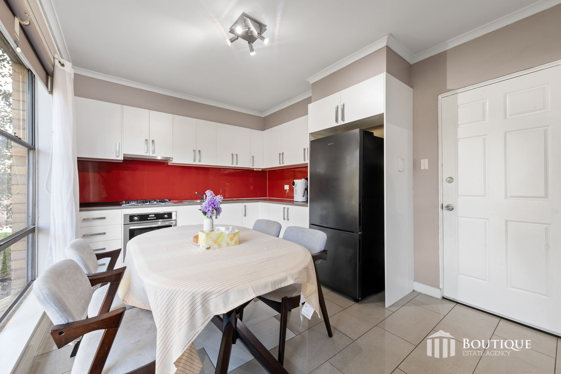 Stepping inside through the ornate, custom timber front door, guests are welcomed to the home’s warm hardwood flooring throughout the living areas, complemented by a light-filled and spacious lounge that creates an inviting atmosphere. Adjacent to this, the magnificent kitchen is both stylish and functional, showcasing large tiled finishes, a striking red splashback, ample bench space, a generous fridge cavity and a 4-burner gas cooktop with oven. Upstairs, the home includes three well sized bedrooms, two fitted with built in robes and one with a walk in robe, all serviced by a fully tiled and decent size central bathroom with a lockable door. Additional features include air conditioning upstairs, gas heating downstairs, plentiful under stair storage, sheer and blackout blinds throughout.