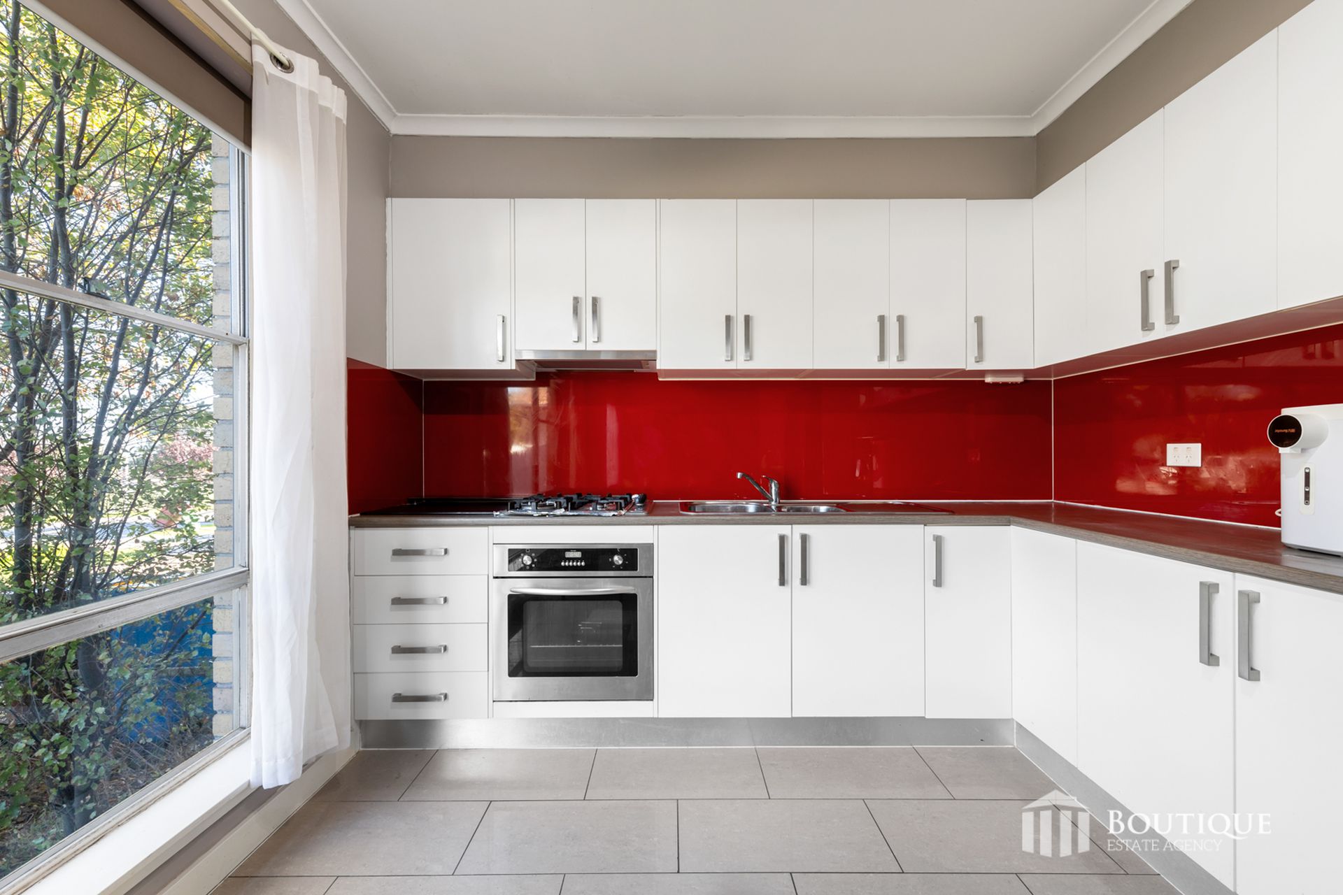 • Kitchen with red splashback, gas cooktop and ample storage